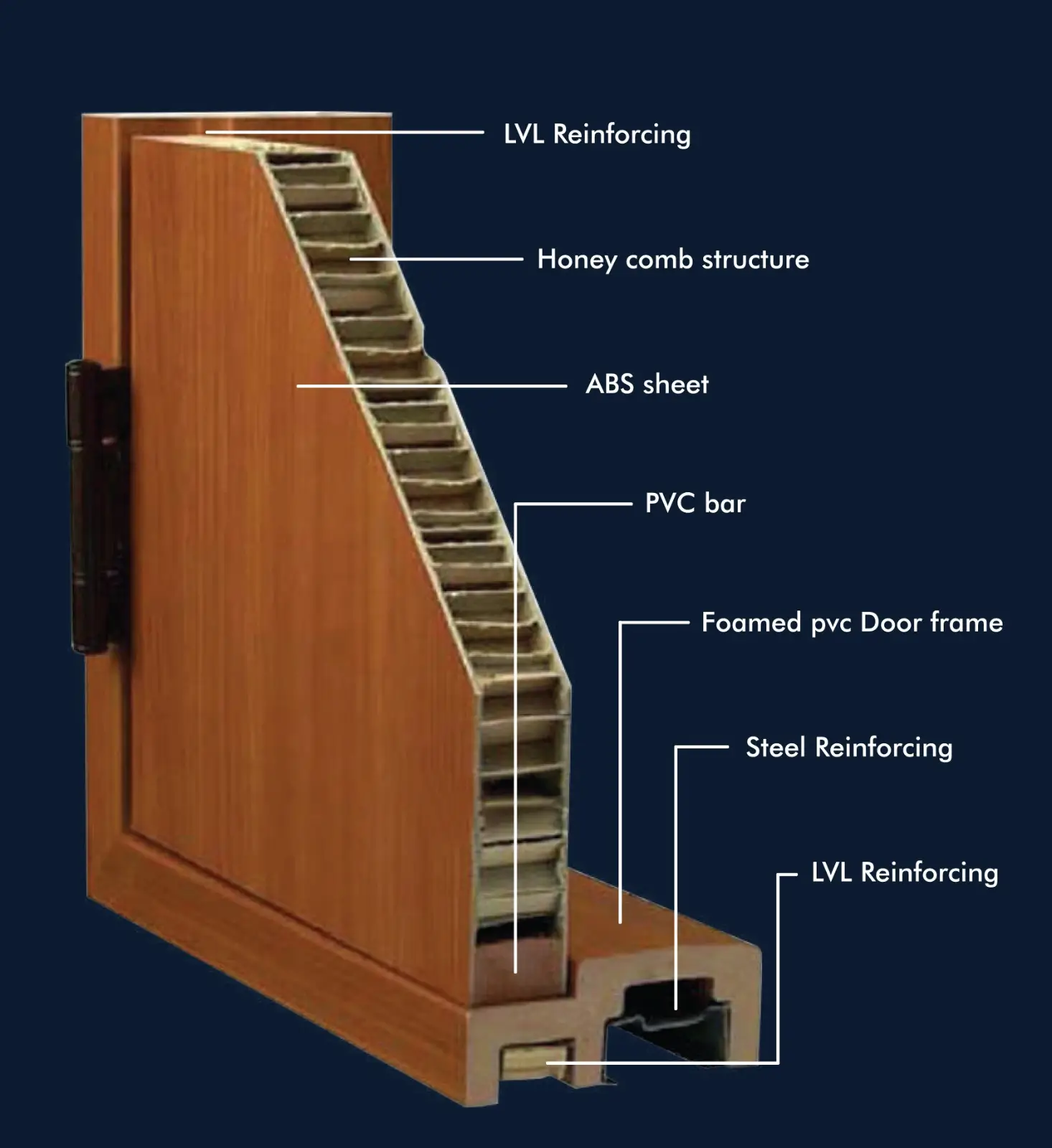 Charan Windows , manufacturers of ABS Pre-hung doors anchor with High Quality Honey Comb as main core filling material supported by oxidized PVC bar and laminated vinyl lumber which has got good moisture resistant which overcome replacement for wooden doors. Honey comb layer insertion is to strengthen the hardness and help in good sound insulation. ABS doors are light in weight and easy to install and maintenance free.